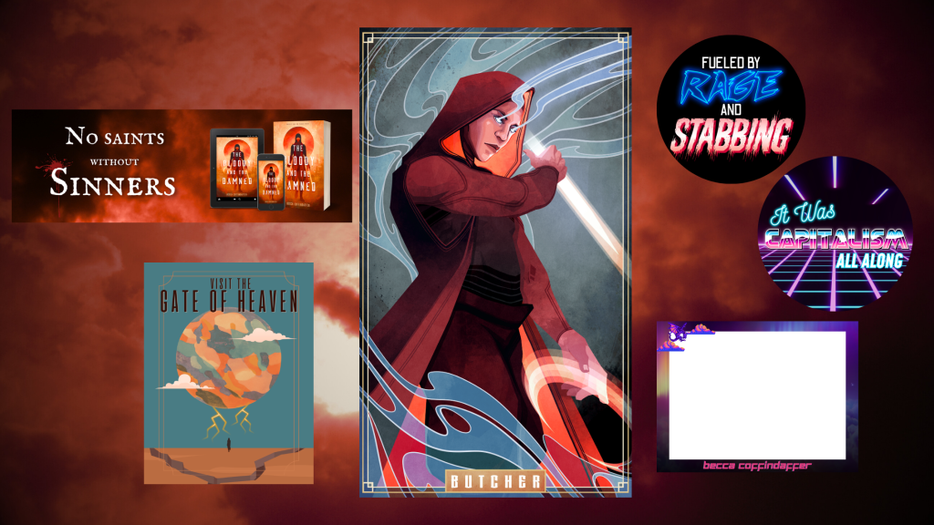 - Two holographic, 80s-style stickers reading “It Was Capitalism All Along” and “Fueled by Rage and Stabbing”